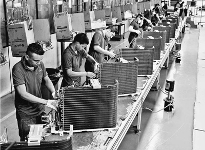 随着中国和巴西经贸往来日益密切,越来越多的中国企业赴巴西投资设厂。图为巴西玛瑙斯企业园区格力工厂生产线上,当地员工正在组装空调。人民视觉
