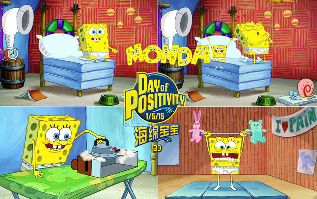 为了帮助大家提起干劲,《海绵宝宝3D》大电影特意选择了2015年的第一个星期一(1月5日)作为“正能量日”(Positivity Day),并连发两款视频鼓励大家开开心心迎接新一年的工作和生活:不仅能在宣传片里看到饰演海盗船长的安东尼奥·班德拉斯绕口令式的祝福,还有由海绵宝宝主唱、派大星捏肥肚子助兴的《星期一之歌》(Thank Gosh It's Monday)主题曲MV的全球首发!