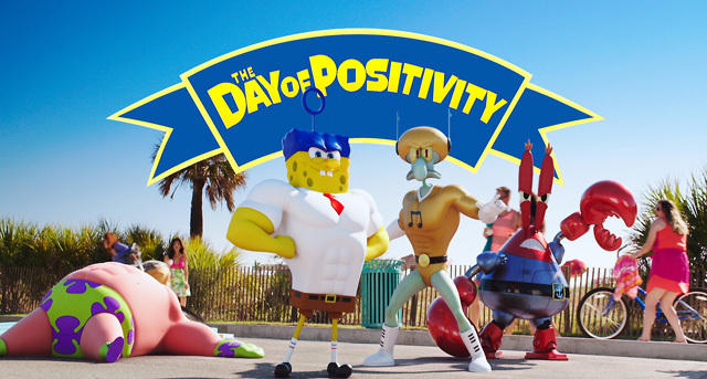 而在另一款宣传片里,当海底居民们听到要上班的消息后都变得十分沮丧,然而海绵宝宝却情绪高涨,带着小伙伴们冲出海底,来到了人类世界,一起变身成超级英雄庆祝正能量日。当他不幸被“坏胡子”船长的炮弹击倒后,躺在派大星的怀中感叹道:“只要有团队合作,即便失败也无所谓。”是不是让你感到精神振奋?
