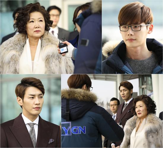 照片中,戴着黑框眼镜的李钟硕对“凡潮百货”的会长金海淑进行采访,金海淑面对不畏惧众多随行人员突击而来的李钟硕毫不畏缩,两人的视线都非常决绝且带着火药味。而在剧中几乎只穿休闲服的金海淑儿子金英光,也穿着高级定制西装站在母亲身边看着李钟硕,眼神透露着紧张。