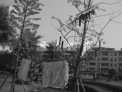 一类是挂在树上、铺在花圃上。我们在街头经常可以看到沿街店户在行道树上钉钉子挂拖把晾晒,在树枝上挂衣服(甚至各色的女士内衣内裤)。对此,老叶也说过很多次了,绿化也是有生命的,花草也需要自由的生长空间和呼吸环境,也十分脆弱,需要每个人的呵护。用铁丝绑她,用绳捆她,东西挂在树枝上,被子盖在花圃上,这些都会让植物受伤。