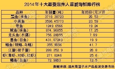 温州网讯 红烧带鱼、清蒸小黄鱼、敲鱼汤……无论是宴请宾客还是家人小酌,每个温州人嘴里,都有一味绕不开的海鲜。在刚刚过去的2014年,温州人最爱吃的海产品有哪些,为什么会对这些海鲜情有独钟,它们的价格和前一年相比又有什么变化呢?昨天,温州菜篮子水产品批发交易市场的一份数据为我们揭晓了答案。鱼(米鱼)、小黄鱼、带鱼是过去一年温州人最爱吃的海鲜前三甲。