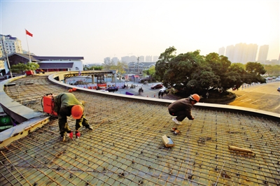 图为昨日下午,几名工人在南塘街天桥上施工。刘伟摄