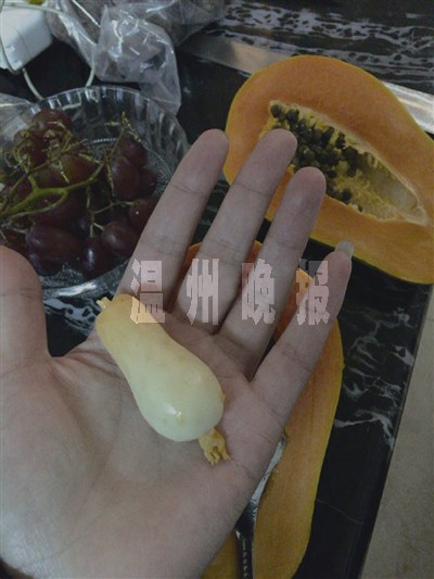 前几日,潘小姐去水果店买了一堆水果,其中就包括这个木瓜。因为买的水果太多,潘小姐已经不记得该木瓜的具体重量和价格,她只记得该木瓜个头中等,表皮绿绿的,并无异样。当晚,她原打算跟四岁的儿子一起吃木瓜,但当儿子看到切开后的那一幕后,不敢再吃了。潘小姐说,木瓜被对半切开,木瓜左半侧果肉里藏着一个白色的小木瓜。该小木瓜约2厘米长,摸起来有点黏稠,瓜身的上半部分呈淡黄色,还长了蒂,下半部分呈白色,顶部还有花蕊。