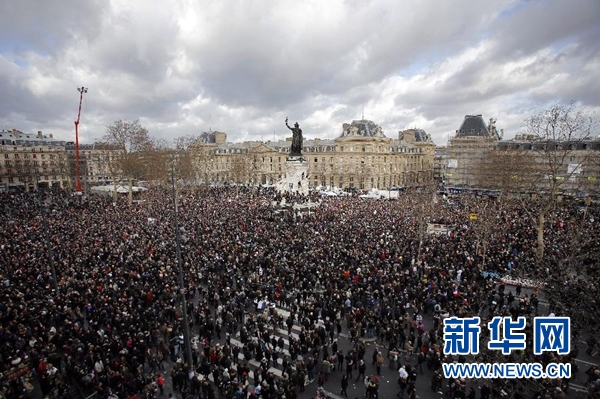 1月11日,在法国巴黎,游行者聚集在共和国广场。新华社照片/美联