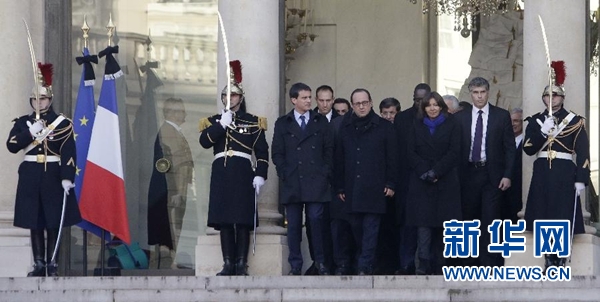 1月11日,在法国巴黎,法国总统奥朗德(中)等政府官员离开总统府爱丽舍宫参加游行。新华社照片/美联