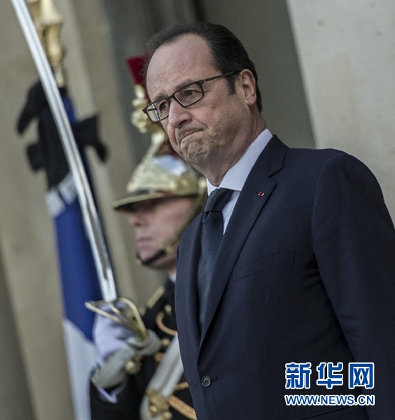 1月11日,在巴黎爱丽舍宫,法国总统奥朗德迎接参加游行的外国领导人。当日,法国政府在巴黎城区举行反恐大游行,法国总统奥朗德以及多位外国领导人参加游行,向近日倒在恐怖分子枪下的逝者致敬。新华社记者陈晓伟摄