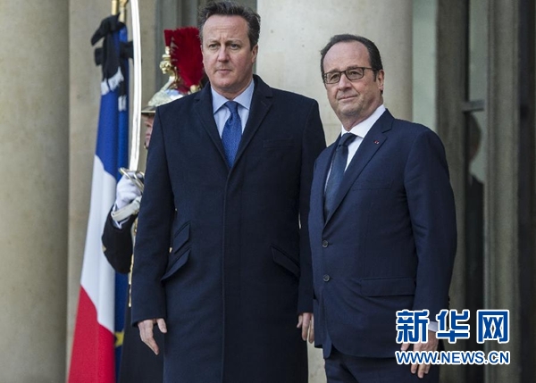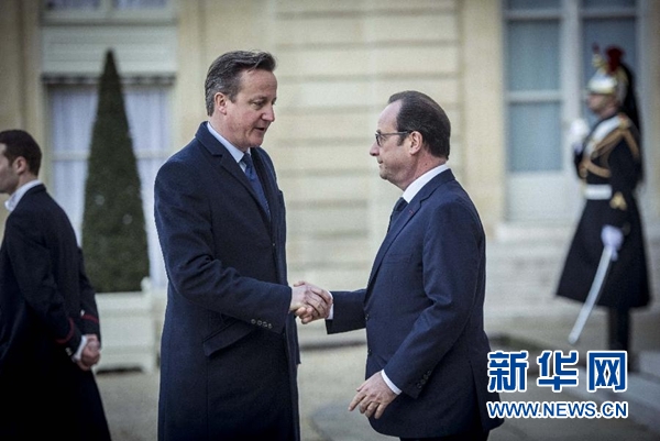 1月11日,在巴黎爱丽舍宫,法国总统奥朗德(右)迎接参加游行的英国首相卡梅伦。当日,法国政府在巴黎城区举行反恐大游行,法国总统奥朗德以及多位外国领导人参加游行,向近日倒在恐怖分子枪下的逝者致敬。新华社记者陈晓伟摄