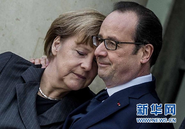 1月11日,在巴黎爱丽舍宫,法国总统奥朗德(右)迎接参加游行的德国总理默克尔。当日,法国政府在巴黎城区举行反恐大游行,法国总统奥朗德以及多位外国领导人参加游行,向近日倒在恐怖分子枪下的逝者致敬。新华社记者陈晓伟摄