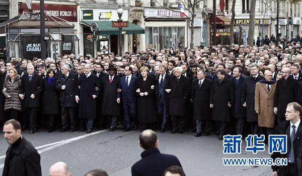 德国总理默克尔、英国首相卡梅伦、意大利总理伦齐、西班牙首相拉霍伊、以色列总理内塔尼亚胡以及欧盟委员会主席容克等参加了反恐大游行。当地时间15时25分许,这些国际政要和法国总统奥朗德手臂相挽,与游行民众一起表达对恐怖主义行径的抗议。与此同时,在巴黎以外的其他一些法国城市和地区,也举行了反恐游行活动。法国媒体称,参加游行的民众超过百万。