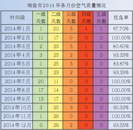 2014年瑞安空气优良天数335天 排温州市第五