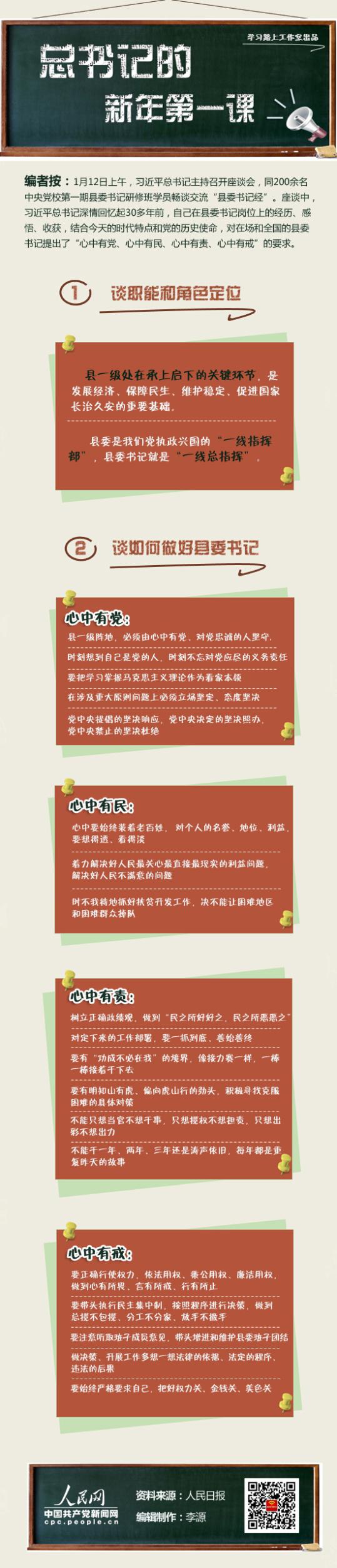 【学习路上按】1月12日上午,中共中央总书记、国家主席、中央军委主席习近平在人民大会堂主持召开座谈会,同200余名中央党校第一期县委书记研修班学员畅谈交流“县委书记经”。座谈中,习近平总书记深情回忆起30多年前,自己在县委书记岗位上的经历、感悟、收获,结合今天的时代特点和党的历史使命,对在场和全国的县委书记提出了“心中有党、心中有民、心中有责、心中有戒”的要求。