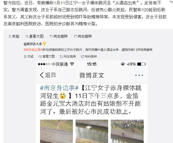 据“南京市公安局江宁分局新浪微博社区委员会专家成员”微博消息,警方回应:近日,有微博称1月11日江宁一女子裸体跳河且“从酒店出来”。此传言不实。警方调查发现,该女子系自己脱衣后跳河,后被热心群众救起,民警和120赶到后联系其父,其父称该女子系前段时间受到惊吓导致精神异常,未发现受到侵害。该女子目前在南京脑科医院救治,医院初步诊断其为精神分裂。