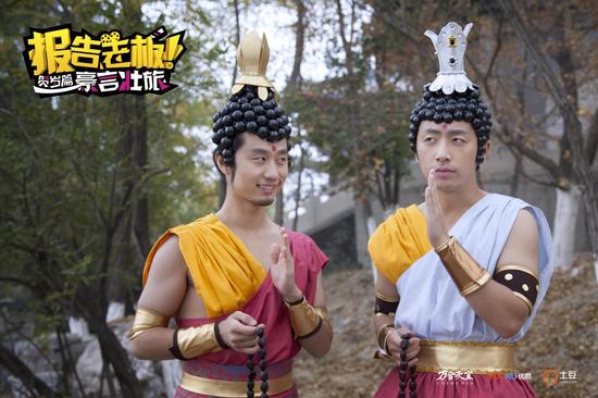 即便寺庙、求佛、供养等元素一一出现在《报告老板!》贺岁第二集《小四代之农金时代》里,观众们也不曾想象过白客,子墨这两个“萌物”竟然真的以菩萨造型出现了。也许是二人造型的还原度太高,也许是伴随着《大悲咒》这样众人皆知却从未有影片用过的BGM,二人脑洞大开的造型完完全全开启了第二季的爆笑之旅。观众们不仅对这一造型拍手不绝,也对二人满满一脑袋的“葡萄”好奇不已。据工作人员透露,那些“葡萄”都是一颗颗黏上去的药丸。不得不说,这两人也是够拼的。