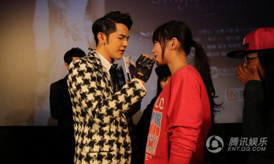 现场,会玩的汪东城也是频频跟粉丝互动。原本安排的“吃饼干”游戏环节,按照原定环节是让他和张馨予一起玩,但大东却突发奇想一定要和粉丝互动,和粉丝脸对脸迅速将一根长饼干对咬到只剩一厘米,险些吻上的四目相对更是让现场女粉丝各种羡慕嫉妒恨。而随后“爱的抱抱”环节,大东更是屡屡被粉丝熊抱袭胸,每次主持人喊停,大东就迅速被四、五个粉丝死死抱住,几次三番下来,汪东城都无奈苦笑,“被撞成内伤,拜托热情的粉丝温柔一点。”