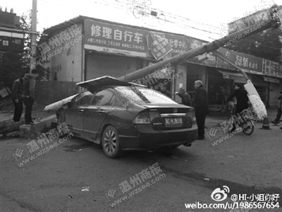 电线杆砸中车顶 所幸车上两人只受轻伤