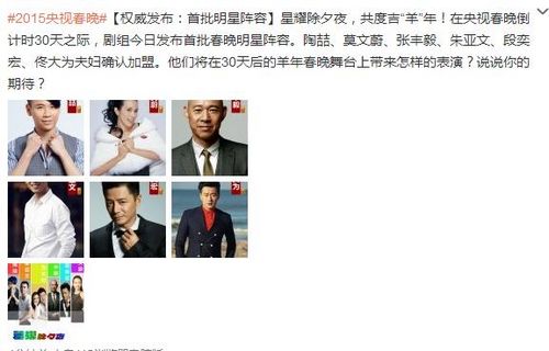 中新网1月19日电今日下午,“2015央视春晚官方微博”发布首批春晚明星阵容,陶喆、莫文蔚、张丰毅、朱亚文、段奕宏、佟大为夫妇确认加盟。