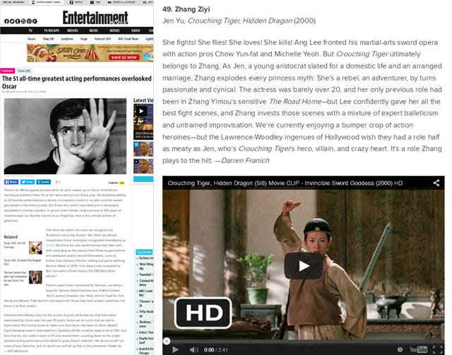 腾讯娱乐讯近日,第87届奥斯卡提名名单公布。每年的奥斯卡提名和颁奖都伴随着不同程度的争议,其中遭到质疑最多的是,一些应该出现在最佳候选名单中的电影和演员,却最终榜上无名。日前,美国《娱乐周刊》(Entertainment Weekly)网站列出奥斯卡86年历史中“51个被奥斯卡忽视的经典表演”名单(The 51 all-time greatest acting performances overlooked by Oscar),其中章子怡以《卧虎藏龙》中玉娇龙一角入榜,位列其中的还有朱丽叶·比诺什(《蓝白红三部曲之蓝》)、娜奥米·沃茨(《穆赫兰道》)、妮可·基德曼(《不惜一切》)、张曼玉(《花样年华》)等。