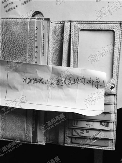 温州网讯 “这钱包被偷,居然还能失而复得。”近日,泰顺的包女士在一次坐车回家途中,钱包被盗,里面除了三千多元的现金外,还有身份证、银行卡、婚戒等重要物品。正当她郁闷时,几天后,她突然收到了从江苏寄来的一神秘包裹,里面竟是丢失的钱包,除了现金和婚戒外,其余东西都在,并且对方还在钱包内夹了一张纸条,上面写有“别再掉落,你一定很急,给你邮来”。