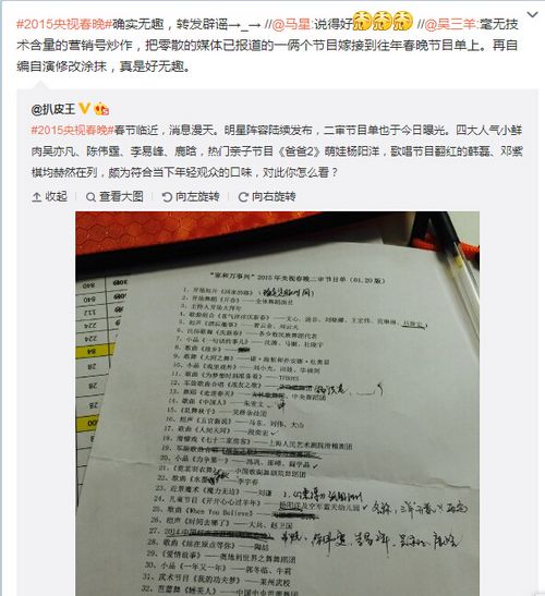 今日,微博实名认证为“扒皮王”的娱乐评论人,发布了一份名为“2015年春晚二审节目单”的图片。名单中,羊年春晚剧组已曝光的明星嘉宾吴亦凡、陈伟霆、李易峰、鹿晗、韩磊、邓紫棋都在其中,而热门亲子节目《爸爸2》萌娃杨阳洋也将表演节目。对于这份名单,央视春晚官方微博第一时间转发并予以辟谣。