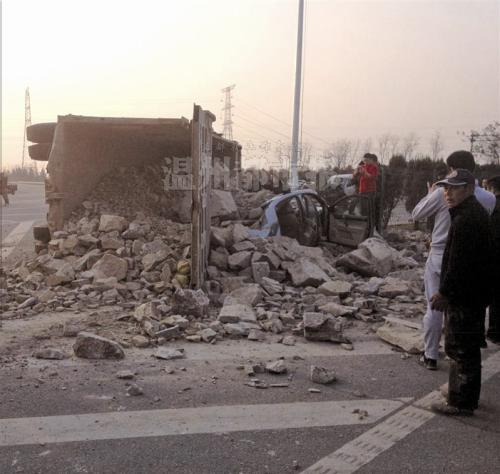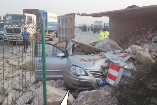 工程车侧翻石头埋住轿车 市民齐搬石4人逃过一劫