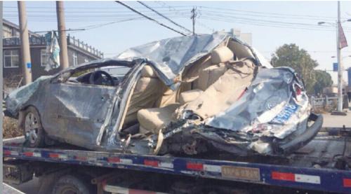 现场:轿车一侧被压成纸片状