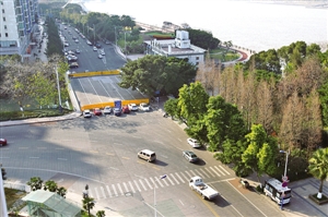 市区望江西路郭公桥路面被水马围挡拦起,通行车子只能绕行。苏巧将摄