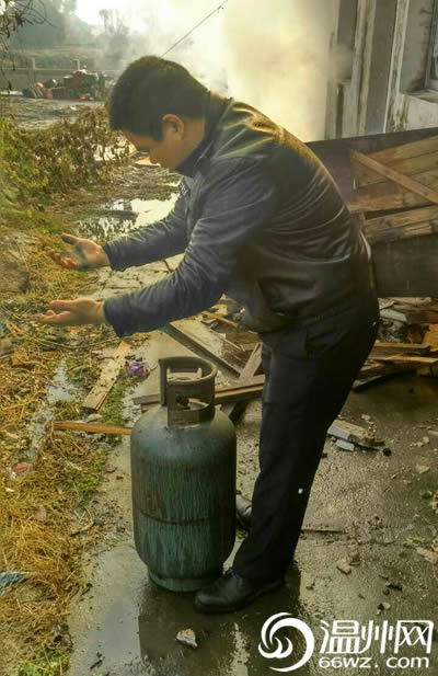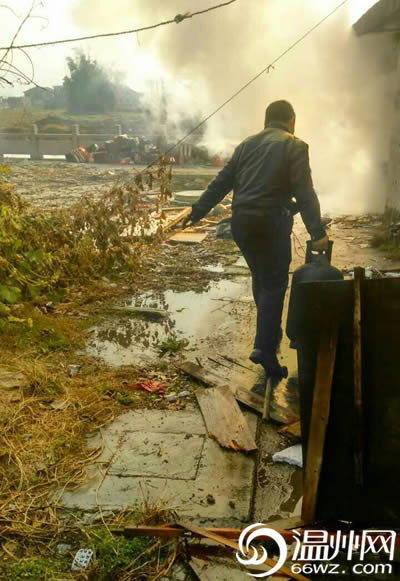 苍南一民房发生火灾 民警从火场中抱出4只煤气罐
