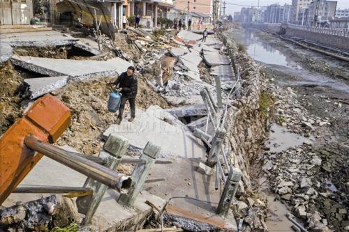 居民陈先生的家虽然没有受到损伤,但他还是很担心。“我两天前就看到地上有3、4厘米的裂缝,还有‘嗡嗡’的声响,当时我就有点害怕,车子都不敢停在家门口了。”陈先生说整个断裂分三次,最先坍塌的是最低的桥栏处,随后是中间的路面,最后是桥附近发生坍塌。