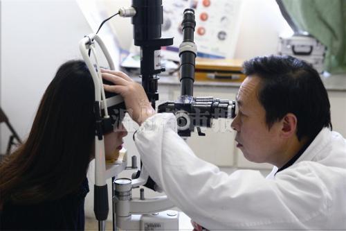 医生给志愿者检查泪膜破裂时间。