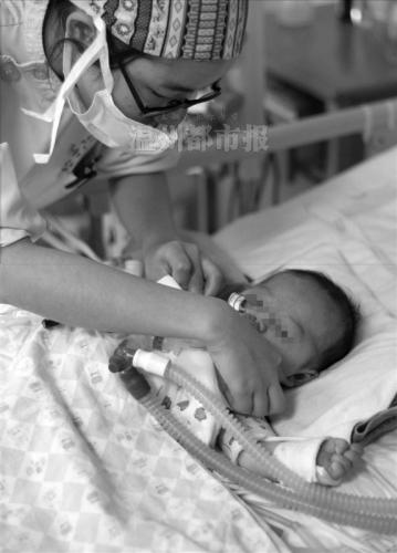 昨晚7时,3个月大的男婴向宏彬躺在温医大附二医心胸外科重症监护室病床上,小嘴巴戴着呼吸器。