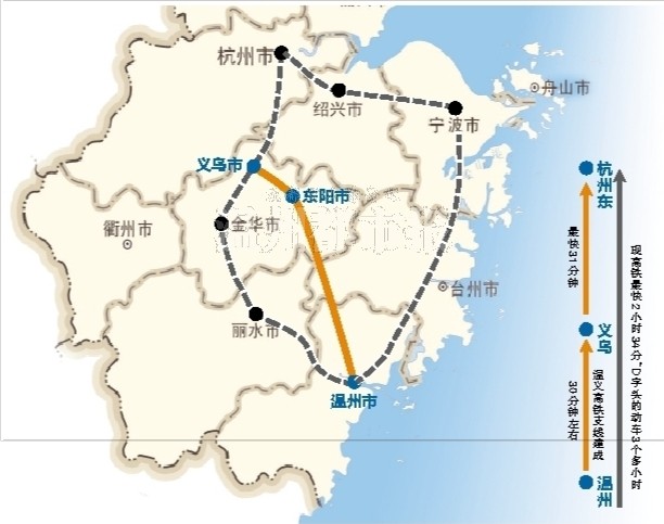 根据12306手机客户端的数据,目前温州、杭州之间高铁最快也要2小时34分,而D字头的动车则要3个多小时。而从义乌到杭州东,最快31分钟就能到达。温义高铁支线如果通了,以后温州到杭州到底要多长时间?按照省人大代表、市发改委主任方勇军的说法,就是一个小时左右。