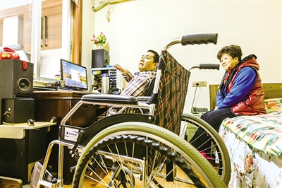 走进陈超的单人房,不大的空间里摆着一张床、一套桌椅和一台电脑,陈超手握鼠标东击西点,操作娴熟,身边放着一根带抓手的金属长杆。见记者进屋,他礼貌地抬头微笑。