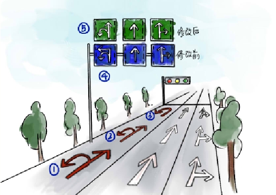 薛林冲说,如果按照更改后的标志⑤,直行是绿灯时,掉头是红灯,左车道前面的车辆若在等待掉头,排在该道的直行车道要等到下一轮直行绿灯时才能通行,因此不太合理。莘塍中队将向施工单位提出修改建议,将左车道定为仅是掉头的车道,并更改相应的交通标志。