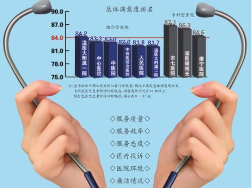美兰德公司是通过与患者面谈、网络辅助电话调查的两类方式进行的满意度测评。测评对象分别为:附一医、附二医、温州市中医院、市中西医结合医院、市中心医院、市人民医院等六家综合性医院,以及温州医科大学附属口腔医院、附属眼视光医院、市第七人民医院、康宁医院四家专科医院。