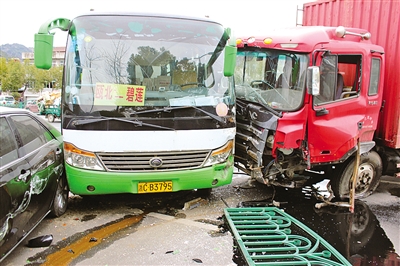 永嘉交警上塘中队的民警赶到现场时,别克车车主正被困在车内,伤情严重,但意识清醒。交警和消防人员随即将他救出,并立即送往医院。红色大货车驾驶室当时有两人,驾驶员在碰撞中腿部被挤压致伤,但并不严重,另一人没有受伤。公交车上当时载有15名乘客,所幸的是只有一名乘客有轻微磕破,公交驾驶员有轻微擦伤,其他乘客完好。黑色丰田轿车内只有驾驶员一人,除车体左侧被擦伤外,驾驶员无大碍。