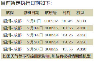 继去年12月19日首班空客A330在温州龙湾国际机场验证飞行成功后,川航温州营业部计划在春运期间不定期安排A330执飞温州成都航线。