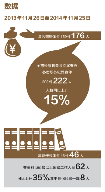 温州网讯 昨天,市检察院通报了2013年11月26日以来查办和预防职务犯罪工作情况。根据通报,温州在一年时间里,查处了科(局)级以上国家工作人员62人,同比上升35%,其中县(处)级干部8人。