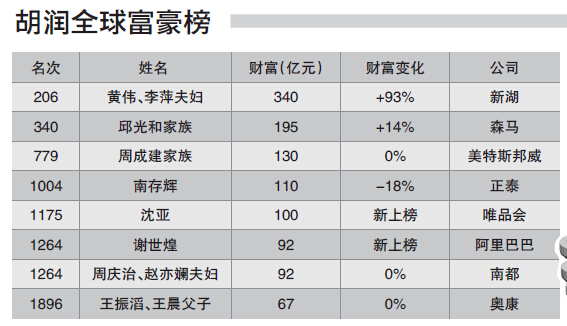 因为股价的飙涨,在过去一年中,黄伟、李萍夫妇的财富增值速度不仅是入围温商中最快的,在全球榜中亦可排到第16位,达到93%的增幅。温商中新上榜的两位,皆来自互联网行业的上市企业,分别是唯品会的沈亚与阿里巴巴的元老谢世煌。