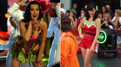 过去的表演中,Katy Perry穿过耀眼的西瓜胸衣,一边唱歌一边拿着巨大的充气草莓,甚至从一个大香蕉里一跃而出。