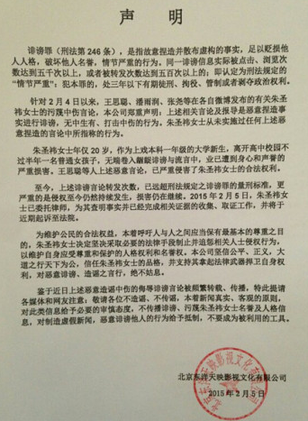 经过一天的发酵,王思聪、朱圣祎网络骂战并未停歇,反倒越演越烈,并多人牵扯其中。终于朱圣祎欲拿起法律武器,起诉王思聪对其人身攻击及诽谤罪,朱圣祎的经纪公司也正式发声明称将绝不姑息这种行为。