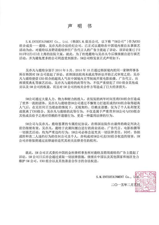 S.M.ENTERTAINMENT Co., Ltd。(韩国S.M。娱乐公司,以下称“SM公司”)作为EXO组合成员——鹿晗、吴亦凡的合法经纪公司,已正式以鹿晗在中国境内擅自从事演艺活动为由,对鹿晗以及聘请鹿晗担任广告代言人的广告主提起了诉讼,该诉讼案已于2015年2月4日在上海的法院立案。就此,为了杜绝鹿晗与吴亦凡今后继续擅自进行演艺活动,并为避免更多的公司利益受到损害,SM公司特发表正式声明如下:
