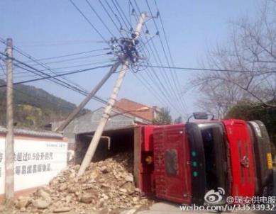 工程车撞到电线杆 致瑞安高楼部分村庄停电