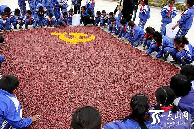若羌县的孩子们用红枣摆出党旗的图案。