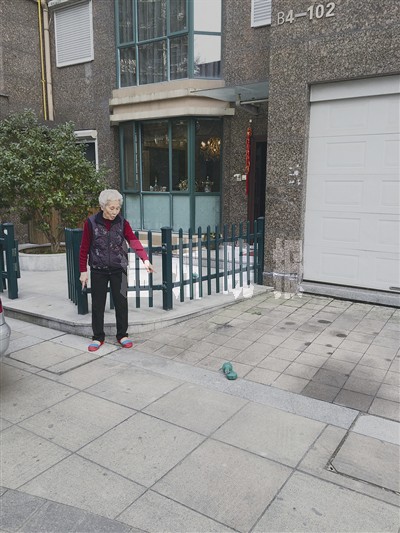 张阿婆出门后,带着垃圾走向离家门口不到10米远的垃圾箱,一阵风吹过,那两块泡沫飘到门口,张阿婆返身去捡,她刚一转身移动了一小步,脚后跟处就传来“啪!”的一声巨响,是一绿色重物,还砸破了石质路面,张阿婆吓得大叫女儿名字。