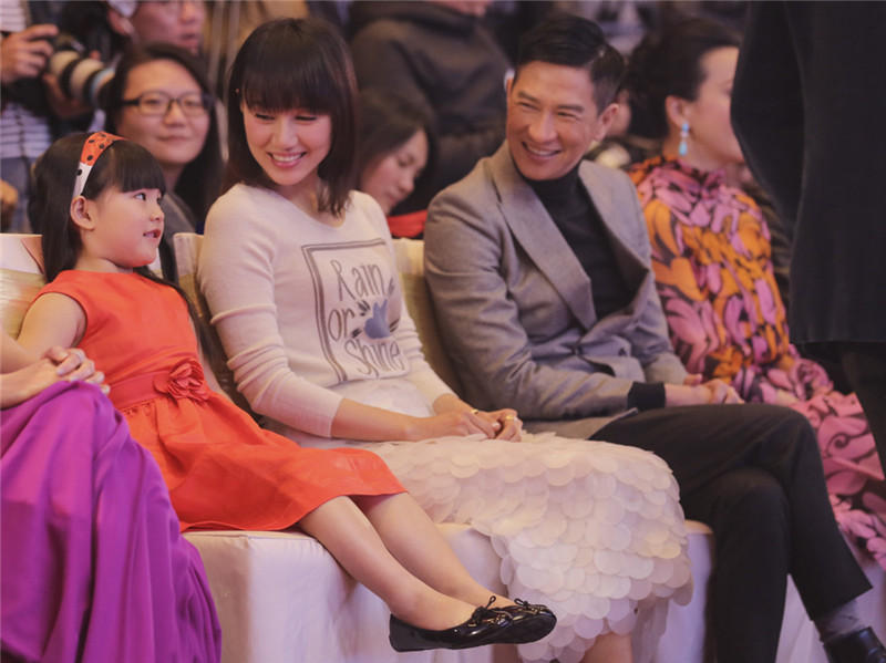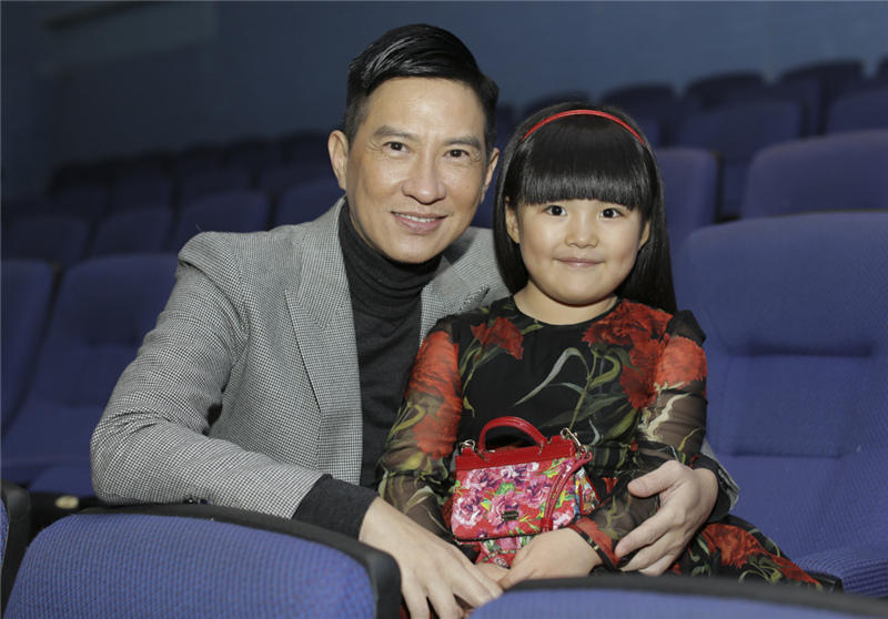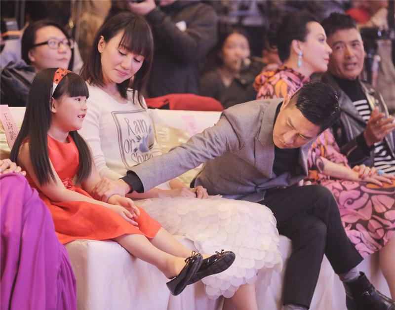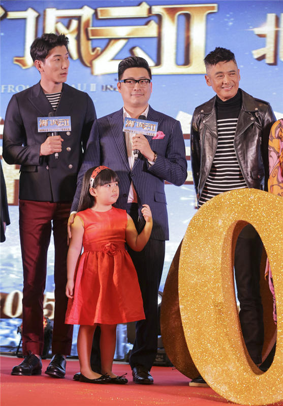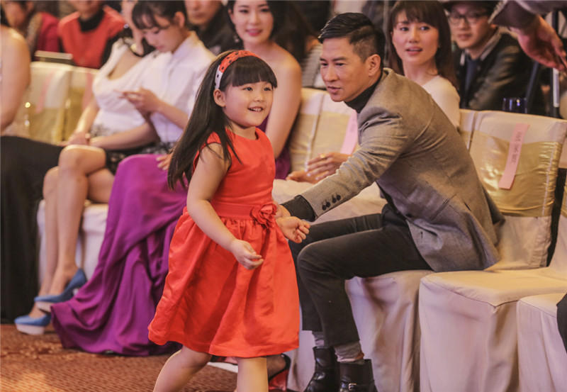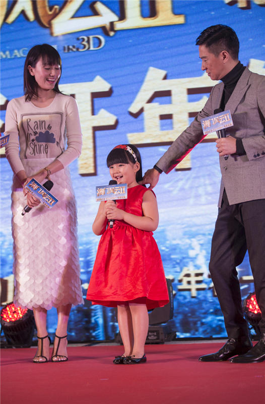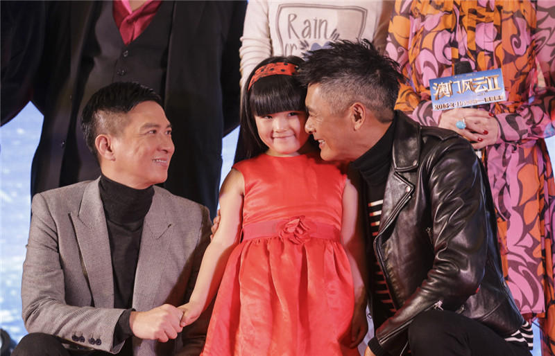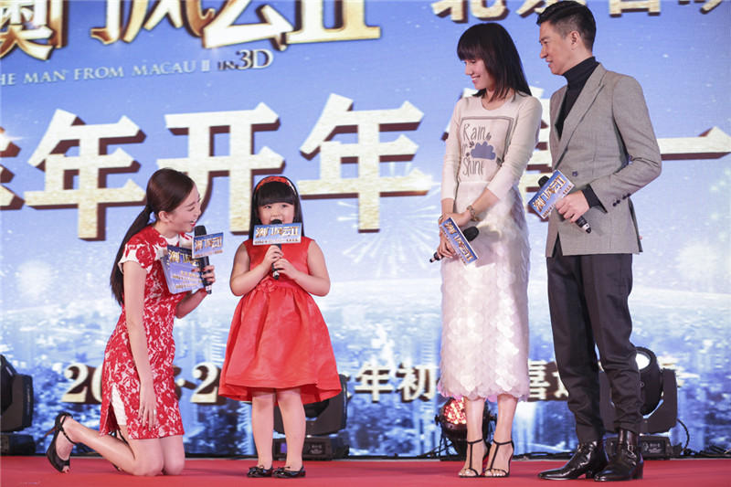 当日,“国民小公主”王诗龄作为《澳门风云2》的主创之一也出席了活动,一袭亮眼的红色公主裙,俏皮可爱。发布会上,王诗龄可谓万千宠爱于一身,不仅得“男神”张亮与老爸王岳伦“护驾”,更被周润发、张家辉两大影帝连连索吻。作为电影中的爸爸,张家辉对这个女儿显露出十足的宠爱,并玩笑道:“Angela实在太可爱了,每一次见到她都想咬一口!”而后王诗龄右手揽着“真爸爸”王岳伦左手揽着“假爸爸”张家辉一同亲密合影,场面温馨搞笑。