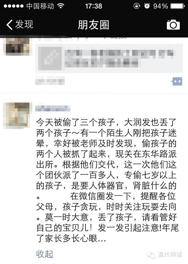 “今天被偷了三个孩子,大润发也丢了两个孩子~有一个陌生人刚把孩子迷晕,幸亏被老师及时发现,偷孩子的人被抓了起来,现关在东华路派出所。根据他们交代,这一次他们团伙共派了一百多人,专偷七岁以上孩子,是要人体器官,肾脏什么的。”近日,有多位网友向温州辟谣举报平台发来类似的求证消息。