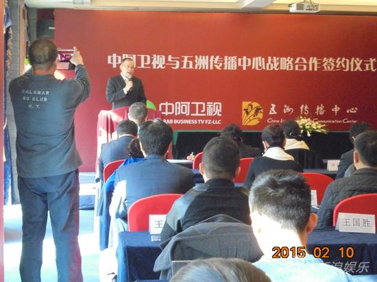 新浪娱乐讯2015年2月10日,中阿卫视与五洲传播中心在北京签署战略合作协议,宣布将在影视制作、节目播出、文化活动等领域加强合作,推动中国文化在中东国家传播,搭建“一带一路”文化交流的桥梁,增进中国与阿拉伯各国人民之间的了解。中阿卫视台长刘海涛和五洲传播中心副主任井水清出席了签约仪式。