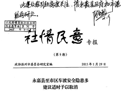 昨天下午,胡晓霞拿到了市长陈金彪的批示:此建议要引起高度关注,请永嘉县政府和市港航局研处。