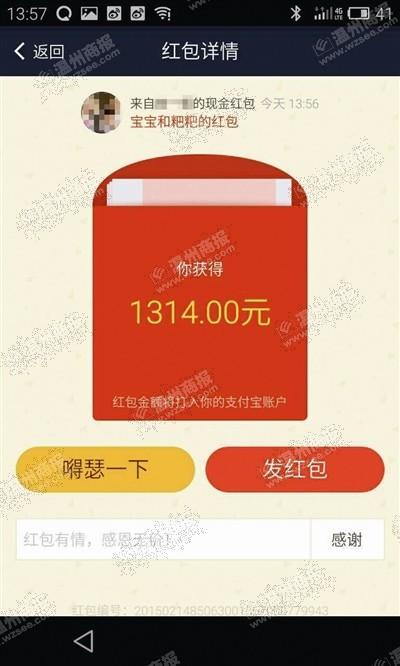 “低调的先生,居然给我打了1314元的红包。”董女士在情人节当天收到了丈夫颇“实在”的情人节礼物。她说,昨天朋友圈被支付宝红包形式的情人节礼物刷屏,估计他看到了,也觉得要有所表示吧。